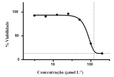 ![]() Figura 6. Porcentagem de viabilidade do inóculo pela concentração do complexo 1 frente as bactérias Pseudomonas aeruginosa