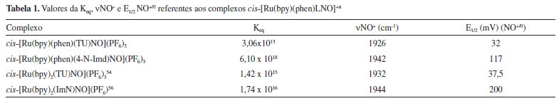 Ao relacionar, na Tabela 1, os valores da constante de equilíbrio, frequência de estiramento e potencial de meia onda do par redox NO+/0 dos nitrosil complexos presentes nesse trabalho e na literatura,43 verifica-se que ao aumentar a deficiência eletrônica sobre o grupo nitrosil há uma intensificação no caráter eletrofílico deste ligante.58 Por isso, constata-se uma maior frequência no estiramento do NO+ e um maior potencial de redução.60