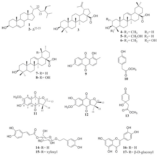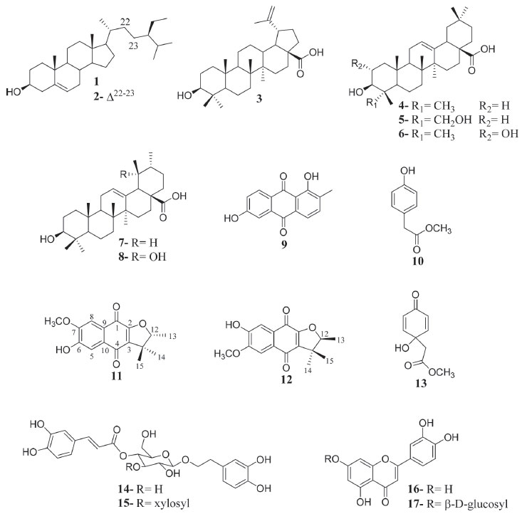 RESULTS AND DISCUSSION The extracts of aerial parts of Sinningia mauroana yielded 17 known compounds, which were identified as sitosterol (1),20 stigmasterol (2),20 betulinic acid (3),21 oleanolic acid (4),21 23-hydroxyoleanolic acid (hederagenin, 5),22 2-α-hydroxyoleanolic acid (maslinic acid, 6),22 ursolic acid (7),21 19-α-hydroxyursolic acid (pomolic acid, 8),21 1,6-dihydroxy-2-methylanthraquinone (soranjidiol, 9),23 methyl 4-hydroxyphenylacetate (10),24 6-hydroxy-7-methoxy-α-dunnione (11),25 7-hydroxy-6-methoxy-α-dunnione (12),5 jacaranone (13),26 calceolarioside A (14),27 conandroside (15),28 luteoline (16),29 and luteoline-7-O-glucoside (17).30 Compounds 1-3 were isolated from the hexane extract, 4-13 from the ethyl acetate extract, and 14-17 from the fraction of the ethanol extract soluble in 1-butanol. The triterpenes 6-8, the naphthoquinone 11, and the flavonoids 16-17 are being described for the first time in Sinningia (Figure 1). All isolated compounds were analyzed by NMR (1D and 2D), and the data were compared with the literature.
