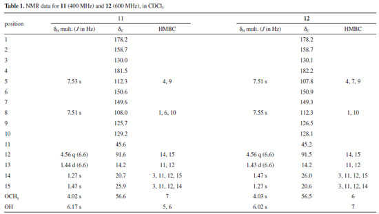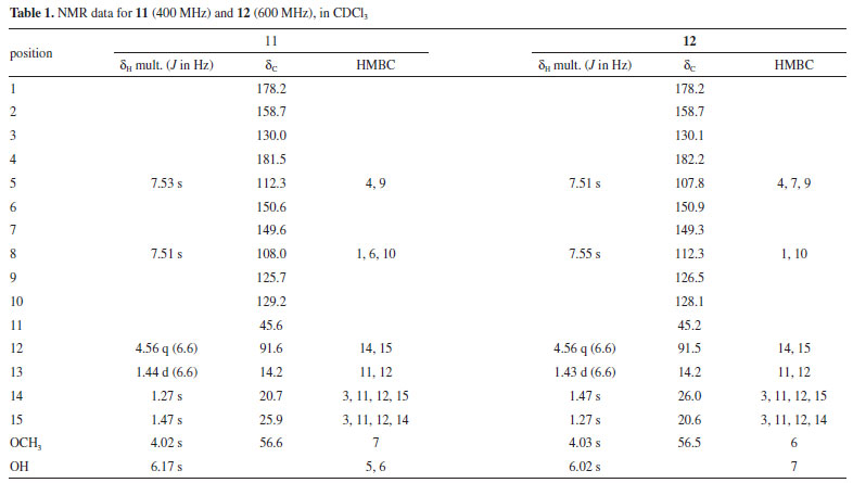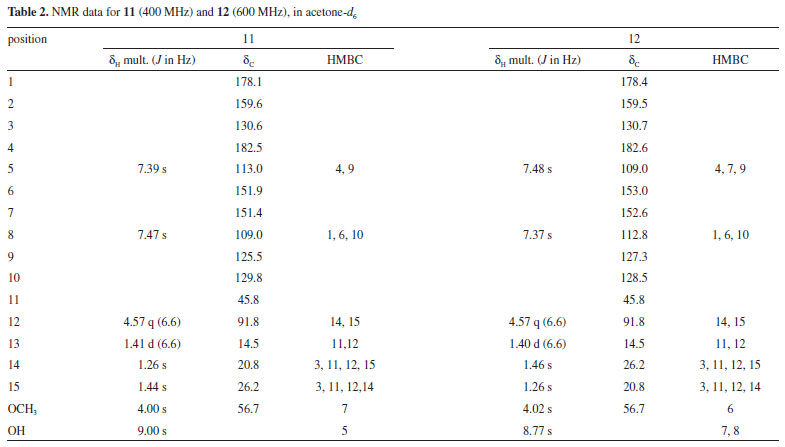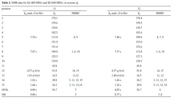 Previously published NMR data of 11 are incomplete and disagree with our results because the spectra were recorded in different solvents,25 but the structure was confirmed by analysis of HSQC and HMBC spectra. The NMR data of the naphthoquinones 11 and 12 are very similar when obtained in the same solvent, making it difficult to discriminate between these isomers by direct comparison with the literature data. However, the distinction is possible considering mainly the chemical shifts of the aromatic hydrogens (H-5 and H-8) and of the hydroxy group. Furthermore, the correlations observed in the HMBC allow the unambiguous assignments of the aromatic hydrogens because C-1 is more shielded than C-4.9 In the 1H NMR spectrum of 11, recorded in CDCl3, the signals of aromatic hydrogens are observed at δH 7.51 (H-8) and 7.53 (H-5), while in the 1H NMR spectrum of 12 these signals are at δH 7.51 (H-5) and 7.55 (H-8). The signal of the hydroxy group is observed at δH 6.17 and 6.02 in the 1H NMR spectra of 11 and 12, respectively (Table 1, Figure 22S). By using a more polar solvent, as deuterated acetone, the chemical shifts of the hydroxy groups are greatly deshielded, and their signals are observed now at δH 9.00 (11) and 8.77 (12) (Table 2). On the other hand, the aromatic hydrogens became more shielded and with better resolution, with signals at δH 7.39 (H-5) and 7.47 (H-8), for the compound 11, and at δH 7.37 (H-8) and 7.48 (H-5), for the compound 12 (Table 2, Figure 28S).