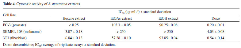 The cytotoxic activity of the extracts was evaluated against PC-3 (prostate) and SKMEL-103 (melanoma) human tumor cell lines, besides the 3T3 (fibroblast) as cell line control. The EtOAc and EtOH extracts were considered inactive (IC50 > 50 µg mL-1) (Table 4). On the other hand, the hexane extract displayed strong cytotoxic activity (IC50 ≤ 10 µg mL-1) against all tested cell lines. The most susceptible cell line was PC-3 (IC50 < 0.25 µg mL-1), followed by SKMEL-03 (IC50 3.07 µg mL-1) and 3T3 (IC50 6.84 µg mL-1). In comparison with the control cell lines (3T3 - fibroblast), the hexane extract showed high selectivity toward the PC-3 (prostate) cell lines. In comparison with the positive control doxorubicine, the hexane extract was more active against SKMEL-103 cell lines and less active against the control cell line 3T3 (Table 4). These results can be explained by presence in the hexane extract of sitosterol (1) and betulinic acid (3). Previous studies showed that 1 induce apoptosis in PC-3 cell lines,40 while 3 is active against several human tumor cell lines, including metastatic melanoma and prostate.41