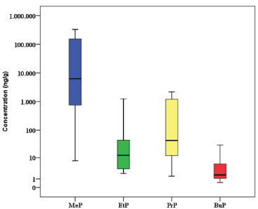 ![]() Figure 1. Concentrations of parabens (ng g-1) in Brazilian baby wet wipes. The horizontal lines represent 10th, 50th and 90th percentiles and the boxes represent 25th and 75th percentiles