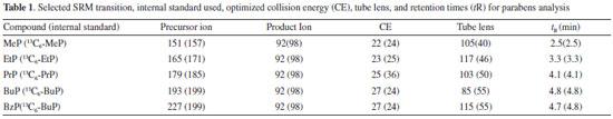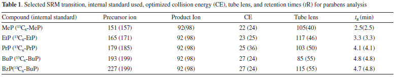 EXPERIMENTAL Chemicals and materials Methyl-paraben (methyl 4-hydroxybenzoate; MeP), ethyl-paraben (ethyl 4-hydroxybenzoate; EtP), propyl-paraben (propyl 4-hydroxybenzoate PrP), butyl-paraben (butyl 4-hydroxybenzoate; BuP), benzyl-paraben (benzyl 4-hydroxybenzoate; BzP) and parabens internal standard mix solution (methyl 4-hydroxybenzoate-ring-13C6, ethyl 4-hydroxybenzoate-ring-13C6, propyl 4-hydroxybenzoate-ring-13C6, butyl 4-hydroxybenzoate-ring-13C6) were acquired from Sigma-Aldrich (St. Louis, MO, USA). HPLC grade methanol was purchased from JT Baker (Phillipsburg, NJ, USA). Ultrapure water used throughout the experiment was obtained from Milli-Q water purification system (Millipore RiOs-DITM, Bedford, MA, USA). The individual stock solutions of each compound and internal standards were prepared by dissolution in methanol and stored in polypropylene capped tube at -20 °C. The calibration and working standard solutions were prepared daily from the stock solutions through serial dilution with methanol:water (1:1), and stored polypropylene capped tube at -20 °C until LC-MS/MS analysis. Instrumentation and sample analysis The analysis was performed with a Thermo Scientific LC system equipped with a pump (Accela 600 pump) and an autosampler coupled with Thermo Scientific TSQ Quantum Access Max with an electrospray triple quadrupole mass spectrometer (Thermo ScientificTM, San Jose, CA, USA). The chromatographic separation was carried out on an Atlantis® T3 dC18 column (75 mm x 2.1 mm i.d. and 3.0 μm particle size, Waters, Milford, MS, USA). A gradient program for the mobile phase was set as the following: mobile phase A was water, and mobile phase B was methanol. A gradient program was used with a total run time of 10 min: 0.00-6.50 min 25-95% B; 6.51-8.00 min 95% B; 8.01-8.20 min 25% B; 8.21-10.00 min 25 % B. The column and sample tray temperature were kept at 40 ºC and 20 ºC, respectively. The mobile phase flow-rate was set 500 μL min-1 and the injection volume was 10 μL. The MS/MS parameters were optimized individually for each compound by continuous infusion of 1.0 μg mL-1 standard solution in the initial mobile phase into the mass spectrometer. Instrument parameters were: capillary voltage kept at −4000 V. Capillary and vaporizer temperature were 220 ºC and 230 ºC, respectively. Nitrogen was used as a sheath gas, and auxiliary gas at flow rates of 20, and 15 arbitrary units, respectively. Argon gas was used as a collisioninduced-dissociation (CID) gas at 1.9 mTorr. The Xcalibur software version 2.0 (Thermo Fisher Scientific) was used to control the instruments and to process data. The selective reaction monitoring (SRM) in negative mode was used. Selected SRM transition, collision energy, tube lens, and retention times for analysis of parabens in baby wipes are shown in Table 1.