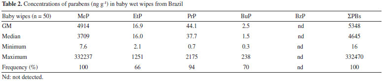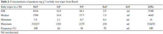 RESULTS AND DISCUSSION The concentrations of each paraben and the total concentrations of parabens (sum of five detected parabens: ΣPBs) found in Brazilian baby wet wipes are summarized in Table 2 and Figure 1. The four parabens, namely, MeP, EtP, PrP, and BuP were detected together in at least 65% of the Brazilian baby wet wipes (BBWW). The rank order of detection rate for each selected paraben was: MeP (100%) > PrP (94%) > BuP (70%) > EtP (66%). Since the BzP was not found in any of the samples, it was excluded from statistical analysis. The highest geometric median concentrations were found for MeP (4914 ng g-1), PrP (44.1 ng g-1), EtP (16.9 ng g-1), and BuP (2.5 ng g-1). ΣPBs concentrations ranged from 16 to 332470 ng g-1, and the geometric mean and median values were 5348 and 4645 ng g-1, respectively.