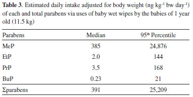 The concentrations of MeP, after logarithmic transformation, were significantly correlated with concentrations of EtP (r = 0.535, p < 0.001), and PrP (r = 0.671, p < 0.001). A correlation among MeP/EtP and MeP/PrP in BBWW samples suggested that these compounds are used in combination. No significant correlations were found among the concentrations of EtP, PrP and BuP. The size of the alkyl group of parabens influences the antimicrobial activity, the larger the chain, the greater the activity.1,8,14,33 Due to the fact of microbial replication occurs in aqueous medium, the use of parabens of higher carbon chain is uncommon in commercial products since an increase in carbon chains decreases its solubility in water.14 Thus, short chain parabens such as MeP, EtP and PrP or mixtures of these are the ones most commonly used in commercial products.34,35 MeP is used either alone or with PrP, EtP and/or BuP because of a synergistic effect. Their presence in cosmetic products, especially long-term exposure on a daily basis, may induce adverse health effects.15,25,26 Brazilian and European Cosmetics Regulatory Agencies consider the use of parabens as preservatives and name them such as 4-hydroxybenzoic acid and its salts and esters. Since the maximum concentration limits for parabens can be found in the legislation with values of 0.4% when used as single ester and of 0.8% when used as mixtures of esters.36,37 According to European agency legislation, BuP and PrP can be used safely in cosmetic products provided that their concentrations do not exceed 0.14% and are prohibited in the use of cosmetic products for children less than 3 years of age. There are also parabens not allowed for use in cosmetic, such as isopropyl, isobutyl, phenyl, benzyl and pentyl parabens.37 In this study, MeP was found in all samples at very high concentration in many of them. The median concentration of MeP was higher than the maximum concentration permitted by the Brazilian and European regulation. It should be noted that 24 out of 50 samples exceed the permitted value of 0.4% for MeP for their use in cosmetics and personal care products. Moreover, the detection rate of PrP and BuP were 94 and 70 %, respectively. Our studies suggest that Brazilian babies may be exposed to parabens and its harmful effects through dermal absorption. Estimation of daily intake (EDI) In addition to other sources, absorption of parabens via skin from the uses of wipes seems to be a relevant route of exposure. Considering the high concentrations of parabens found in BBWW and dermal absorption coefficient of parabens, the use of these wipes may constitute an important source of exposure to babies. The evaluation of the quantity and frequency of use of wipes over a day is still scarce. However, the frequency of use can be estimated by a specialist considering that a wiping with moist wipes is performed with each diaper change, which results in an average of five times of use per day. Moist wipes for commercial babies weigh approximately 5 g per wipe. During the hygiene of the baby, contact with the dermis is not permanent and not all the surface of the wipe is used, therefore, a retention factor should be applied.38 According to de van Engelen,39 each time a baby wipe is used, there is a dermal contact of 0.5 mL of liquid with the skin. If 5 g of wipes are used five times a day and considering the retention factor 0.1, the final value on the skin will be 2.5 g/day. Thus, dermal intakes of parabens could be calculated on the basis of equation:40 ![]() where EDI is estimated daily intake adjusted for body weight (ng kg-1 bw day-1); C is the paraben concentration in wet wipe samples (ng g-1); A is amount of product applied pert time and was assumed to be 5 g; F is frequency of use and was assumed to be 5 events/day; Rf is retention factor (0.1); DA is the absorption fraction; and w is average body weight of a boy of 1.0-year-old child of 11.5 kg (kg bw). For C, the geometric mean and 95th percentile concentrations of parabens were used for average and high exposure scenarios, respectively. For DA, as the dermal absorption of parabens, we used a value of 36%, 55%, 37% and 42% for MeP, EtP, PrP and BuP, respectively in our calculation.38,40 Estimated daily intake adjusted for body weight of parabens and sum of them are shown in Table 3. The highest EDI values were found for MeP, followed by PrP, EtP, and BuP. The median EDIs of MeP, PrP, EtP, and BuP were 385, 3.5, 2.0, and 0.23 ng kg-1 bw day-1, respectively. The EDI values found for parabens from baby wipes were below the acceptable daily intake (ADI) of 0-10 mg kg-1 bw day-1 for MeP, EtP and their sodium salts, according to the European Food Safety Authority's recommendations.41