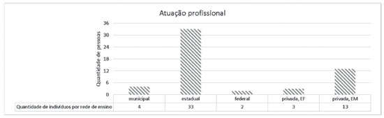 Estes PEBs (80% dos participantes) possuem mais de 6 anos de experiência profissional, atuando nas redes de ensino da Figura 3. Pontuamos aqui que o somatório de indivíduos apresentados na Figura 3 não equivale ao total de participantes da pesquisa, pois um PEB pode atuar em mais de uma rede de ensino, o que ocorre para alguns dos PEBs que participaram dessa pesquisa.