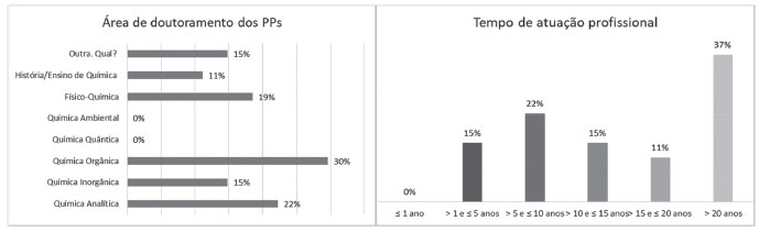 Mesmo que não haja uma clareza de objetivos (ou seja do ponto exato onde querem chegar), pode-se dizer que apresentam um início de pensamento crítico com relação ao processo de ensino e a sua prática profissional. E esse pensamento crítico precisa ser amadurecido ao longo do MP para que o profissional formado possa ser mais/melhor atuante em sua comunidade e na sua profissão. Quanto aos PPs participantes, diferente do que ocorre para os PEBs, a maioria é de mulheres (59%), estando a maior parte destas atuando na região nordeste (11 de 16 mulheres). As caracterizações de área de formação a nível de doutorado são variadas, com uma leve predominância da Química Orgânica, e o tempo de experiência profissional para a maioria é de mais de 10 anos, como representados na Figura 5. Pontuando que para as áreas de doutoramento o somatório ultrapassa os 100% devido a um mesmo PPs informar dois doutorados em áreas distintas.