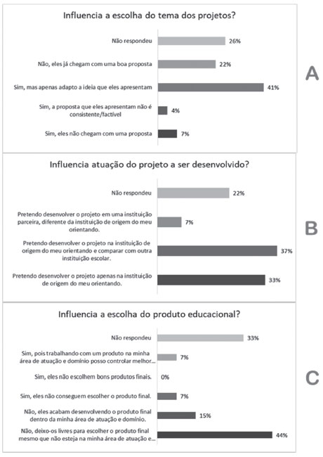Tais atuações representam, para 67% dos PPs, experiências com outros níveis de ensino, de forma direta ou indireta, antes da atuação na atual IES e no PROFQUI, o que pode impactar de maneira construtiva e positiva a participação destes PPs na formação dos PEBs participantes do Programa. Quando questionados sobre as atuais atuações dentro da IES, os PPs indicaram que atuam em vários níveis em suas instituições; não apenas na graduação presencial (96% dos PPs) e à distância (33% dos PPs), mas também em especializações presenciais (7%) e à distância (7%), em outro MP (11%), em MA e DA do mesmo instituto (11%) ou de outro instituto (33%). Essas diferentes experiências têm potencial para enriquecer o programa, quando utilizadas de forma construtiva na formação dos PEBs participantes e/ou orientados. Sobre a origem de participação no PROFQUI, um PP que não compusesse a equipe inicial de implantação do Programa poderia ingressar, de duas formas: sendo convidado pela coordenação (equipe coordenadora) ou se candidatando voluntariamente a participar do Programa. Os PPs que participaram desta pesquisa indicaram que 41% foi convidado pela coordenação para compor o quadro docente, e que 37% se candidataram a vaga no quadro docente do Programa. Independente da forma de ingressos, todos os PPs participantes informaram atuação dentro do PROFQUI, seja através da condução de disciplinas (que, por serem poucas, acabam sendo dividas entre 2 ou 3 PPs - 74% dos PPs divide disciplinas com outros docentes) ou através da orientação de PEBs (41% dos PPs iniciou uma orientação). Como o levantamento destes dados em 2017 ocorreu no meio do primeiro semestre de implantação do Programa, e a escolha de orientadores ocorre no final do primeiro semestre, nem todos os PPs estavam com orientações iniciadas, devido ao pouco tempo de contato com os PEBs; por isso o baixo índice de PPs com orientações iniciadas. As questões referentes a relação com o orientando se dividem em três questões: sobre a escolha do tema, sobre a condução do projeto, e sobre a escolha do produto educacional; sendo as respostas apresentas no conjunto de gráficos que constitui a Figura 7.