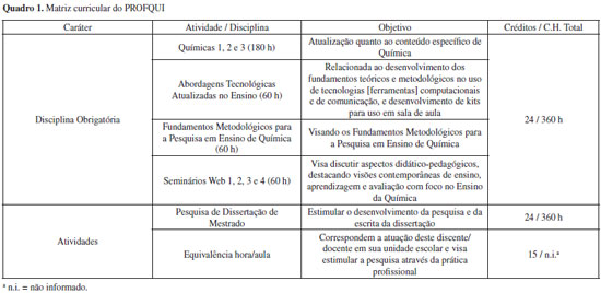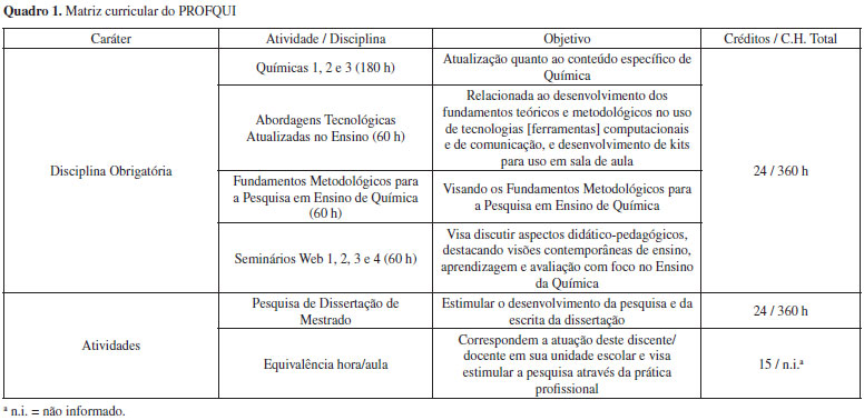 CONSIDERAÇÕES FINAIS No atual quadro educacional, o docente vem sendo cada vez mais cobrado e menos preparado em sua formação em nível de graduação para a atuação profissional. É exigido do docente lecionar o conteúdo, organizar situações de aprendizagem, promover situações que permitam que os alunos transitem entre o senso comum e o conhecimento científico, inserir o aluno tecnologicamente, conscientizar ambientalmente, preparar socialmente, dentre outras funções acumulativas em sua jornada de trabalho. Ainda sobre a atuação docente, Kuenzer58 (p. 686) coloca que o docente deve "suprir, em uma escola precarizada, com condições de trabalho cada vez piores, as deficiências culturais e cognitivas decorrentes da origem de classe da maioria dos alunos". A formação do professor reflexivo não valerá a pena se não envolver a formação docente na luta contra a atual situação política e econômica.59 A formação continuada está inserida em um cenário de desvalorização da atividade docente; devido à fragmentação das ações nas políticas públicas de formação profissional do magistério.60,61 Apesar de todos os esforços e compreensão de fatos, o texto apresentado no decreto que institui a Política Nacional de Formação de Profissionais do Magistério da Educação Básica (decreto 6755/09)41 não expressa claro entendimento de que um dos requisitos básicos para a educação de qualidade seja a valorização docente. A formação continuada se tornou um pré-requisito para uma transformação docente mais pronunciada, devido às oportunidades que surgem ao docente durante o processo de formação para vivenciar pesquisas e experiências que podem ser aplicadas em sua atuação profissional. Porém, cabe destacar que apesar dos benefícios e atuações da formação continuada, uma boa formação em nível de graduação (e a melhoria do atual processo) ainda é importante.62 Vários estudos sobre as tendências atuais na formação continuada apontam a necessidade de eleger a escola como lócus privilegiado dessa formação,63 articulando a formação no próprio local de trabalho, elaborando um projeto coletivo com participação da comunidade escolar para articular a prática pedagógica. O objetivo de fazer da escola o ambiente da formação não é usar os problemas da escola como origem da formulação dos objetivos do MP, mas proporcionar o domínio de novos conhecimentos, melhorando a EB. É importante ter o MP como foco de estudos para que as contribuições da sua proposta de atuação e seu formato sejam verificados, bem como seus reflexos na melhoria na qualidade da educação básica sejam efetivadas. É justamente isso que justifica o projeto de acompanhamento do PROFQUI, ora em curso. Nesse sentido, neste artigo, buscamos promover a reflexão que já ocorre em outros MPs voltados para a formação docente, sobre o aperfeiçoamento da atuação docente através da formação continuada dos professores de Química e sobre os produtos educacionais por eles desenvolvidos. Além disso, é importante que os MPs estejam em constante adaptação para que continuem atendendo às necessidades da educação básica dentro de suas especificidades (quando capacitam esses docentes de forma direcionada), pois só através da reflexão e das discussões é que essa adaptação é passível de ocorrer. Em observação aos dados apresentados, a titulação do corpo docente permanente dos PPs do PROFQUI, participantes desta pesquisa, associada fortemente à Química Acadêmica, e dos recursos didáticos utilizados pelos mesmos serem basicamente livros, artigos científicos e aulas em softwares de apresentação pode, em alguns aspectos, ser favorável a construção do conhecimento químico, mas também pode ser desfavorável à construção de um PEBs enquanto professor-pesquisador da sua prática profissional e mediador da construção do conhecimento dos alunos da educação básica. A formação de um docente realmente capacitado em suas atividades laborais depende de diversos aspectos além do "saber o conteúdo". Foi possível notar, com o levantamento, que os PEBs esperam a construção de melhorias no desenvolvimento profissional para o Ensino de Química. Essas melhorias versam não apenas sobre a atualização científica em Química, mas também sobre recursos didáticos e possíveis práticas/atividades que contribuam com a sua atuação profissional. E todos esses pontos estão presentes e são incentivados pelos documentos norteadores da educação e pela evolução da sociedade. Algumas dessas possibilidades efetivas de construção profissional dos PEBs podem não ser totalmente supridas pelo programa, uma vez que o mesmo foca na atualização dos conhecimentos químicos e não na formação didático-pedagógica do docente para o ensino de Química, o que pode ser percebido não apenas em seu regimento, mas também em sua matriz curricular ou mesmo pela formação docente dos PPs participantes da pesquisa e seu tímido uso de recursos didáticos mais variados. É necessário que, mesmo que o foco do Programa seja o desenvolvimento de conteúdo específico, a abordagem desse conteúdo fomente, também, as necessidades dos alunos da educação básica, e não apenas foque na atualização científica do professor de Química. Os objetivos enunciados pelo PROFQUI precisam se materializar e evidenciar em toda a sua estrutura; um bom passo é a existência de LP que abordem conhecimento específico e metodologias e recursos diversificados; porém, os PPs que as constituem devem se adaptar a essa proposta metodológica dento das respectivas LP. Talvez esse seja um obstáculo para o desenvolvimento do programa ao longo dos anos, assim como foi para outros programas no âmbito do ProEB, como o PROFMAT.64 Como próximas etapas desse estudo longitudinal, pretende-se continuar o levantamento de dados e documentos relacionados direta e indiretamente a