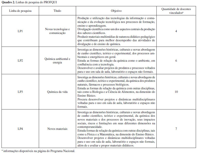 Com relação as Linhas de Pesquisa (LPs) possíveis, as mesmas se distribuem entre conhecimento químico específico e desenvolvimento didático-pedagógico docente (Quadro 2), porém, todas apresentam alguma possibilidade de relacionada a produção e/ou análise de recursos didáticos de variados tipos, bem como a promoção da divulgação científica, a proposta de trabalho interdisciplinar e contextualizado, e metodologias diversificadas para o processo de ensino de Química.
