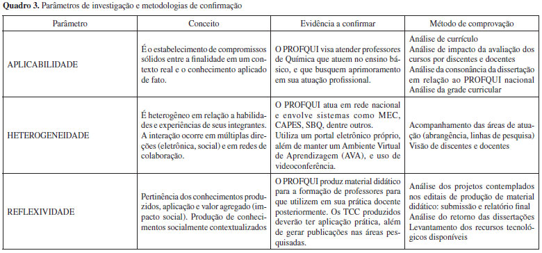 PROCEDIMENTO METODOLÓGICO Conforme já mencionado, este artigo é parte de um estudo longitudinal em desenvolvimento, que envolve acompanhamento do PROFQUI desde a sua implantação, e consiste em uma pesquisa empírica e exploratória, de natureza quali-quantitativa. A proposta deste estudo longitudinal é investigar os três parâmetros de propostos por Gibbons e colaboradores,53,54 aplicabilidade, heterogeneidade, reflexividade. Tais parâmetros foram definidos a partir dos princípios de produção de conhecimento e dos critérios de avaliação dos Mestrados Profissionais estabelecidos pela CAPES, e são apresentados no Quadro 3, juntamente com o método de comprovação a ser empregado.