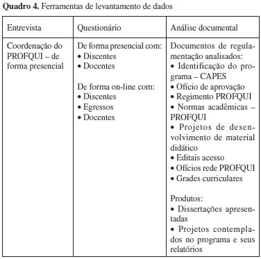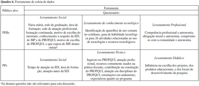 Sobre as IES selecionadas, foram levantadas algumas informações relevantes, obtidas de suas páginas oficiais: Universidade Federal do Rio Grande do Norte: é uma IES brasileira com sede na cidade de Natal, criada em junho de 1985. O PROFQUI nesta IES possui 13 docentes ativos, e a sua página oficial não possui muitas informações relevantes além das relativas ao edital de seleção 2017. Universidade Federal Rural de Pernambuco: é uma IES com sede em Recife, fundada em 1912. Na página desta IES não há informação específica ao PROFQUI da unidade. Universidade Federal de Alagoas: é uma IES com sede em Maceió, foi fundada em 1961. Sobre o PROFQUI, a página oficial da instituição não apresenta informações sobre o mestrado e nem o seu Campus. Universidade Federal do Paraná: Com sede em Curitiba, essa IES foi fundada em 1912, mas seu histórico de construção data de 1892, sendo considerada a mais antiga do Brasil. Assim como outras instituições acima apresentadas, essa IES não possui em sua página oficial informação sobre o PROFQUI. Universidade Estadual de Londrina: criada por Decreto a partida da junção de 5 faculdades em 1970, essa IES possui sede em Londrina. Os dados referentes ao PROFQUI encontram-se em área específica, sendo identificado dentro do Centro de Ciências Exatas, área Química. Contém informações de Apresentação, Informações gerais do programa, as linhas de pesquisa seguidas, a lista das disciplinas obrigatórias e suas respectivas ementas, corpo docente, dados de processo seletivo, formas de contato com a coordenação geral e a local, os horários de atendimento da secretaria, formulários referentes ao curso e um campo para dissertações defendidas (a ser preenchido conforme surgirem). Universidade Federal do Rio Grande do Sul: sediada em Porto Alegre, esta IES foi fundada como universidade em 1934. As informações referentes ao PROFQUI resumem-se em dados de contato e redirecionamento para a página oficial do PROFQUI. Como ferramenta de coleta de dados, fez-se uso de dois recursos para os dois grandes grupos participantes (PEBs e PPs), conforme Quadro 6.