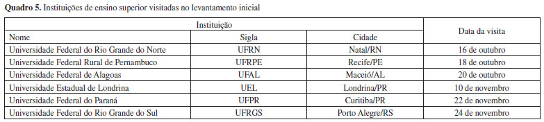Os sujeitos da pesquisa aqui apresentada foram 44 professores de Química da Educação Básica (PEBs), que matriculados no PROFQUI em sua primeira turma (no ano de 2017), e 27 professores-pesquisadores (PPs) das IES participantes do levantamento inicial. Não houve uma pré-seleção dos participantes, uma vez que o objetivo da pesquisa era levantar o quadro mais amplo possível. A participação deles ocorreu por disponibilização para participar da pesquisa, mediante uma visita realizada nas IES. Tal visita foi previamente agendada por e-mail e telefone com os coordenadores do Programa, e as IES visitadas foram previamente selecionadas de acordo com suas posições geográficas e tendo respondido positivamente ao contato inicial. Das 06 IES selecionadas, todas retornaram positivamente ao agendamento da visita, e as visitas foram realizadas em outubro e novembro de 2017. As instituições participantes (Quadro 5), que se dividem em duas regiões, nordeste e sul.