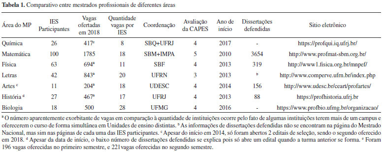 Dentre os vários tipos de formação continuada, um que vem ganhando espaço é o Mestrado Profissional (MP), que está instituído dentro do ProEB, e é promovido por Instituições de Ensino Superior (IES) "de notória tradição na área de formação de professores e que sejam partícipes do Sistema Universidade Aberta do Brasil".28 Diferente do que ocorre com os Mestrados Acadêmicos (MAs), cujo enfoque é a construção de conhecimento técnico sobre uma área do conhecimento científico, nos MPs29,30 se busca aproximar a produção acadêmica das atividades laborais da sociedade.31,32 O enfoque e investimento da CAPES nos MP, de acordo com Ribeiro33 (p. 1), possui três motivos baseados no desenvolvimento social e econômico do país: (i) "a sociedade atual requer uma formação cada vez mais qualificada, mesmo para setores que não lidam com a docência nem com a pesquisa de ponta"; (ii) "com o aumento das titulações no País, constata-se que boa parte dos mestres e uma parte significativa dos doutores encaminham-se para um destino que não é o ensino superior"; (iii) "a inexistência de preconceito da Capes quanto à transferência de conhecimento científico para as empresas ou para o mercado, desde que a sociedade como um todo, e o setor público e os movimentos sociais em particular, também sejam alvo dessa transferência". Por esses três motivos acredita-se que a CAPES facilita e investe na aplicação prática dos conhecimentos científicos fora das IES (a proposta central dos MP). Um MP voltado para a formação docente tem como foco preparar os docentes para atuação na dinâmica escolar, melhorando didaticamente a atuação de um professor da educação básica e fazendo com que este investigue e evolua dentro do seu próprio meio profissional.34,35 É um espaço propositivo de construção e aprofundamento das relações entre universidade e escola. Porém, é necessário que haja "uma reflexão aprofundada sobre a natureza do Mestrado Profissional [...] e seu impacto na sociedade" (p. 69) para que seus resultados sejam efetivos.36 De acordo com Nunes,37 um MPE, bem como um MP para formação docente, possui um cenário potencial para a efetiva qualificação dos professores da Educação Básica, pois busca: (i) a motivação dos professores; (ii) a compreensão desses a respeito do papel de um MP; (iii) a contribuição que as experiências vividas no MP podem proporcionar às práticas docentes cotidianas; e (iv) aumento do alcance e o fluxo de saberes entre a universidade e a escola. O auxílio, portanto, é justamente o de proporcionar a pesquisa dentro da formação docente como elemento articulador e colaborativo em vários pontos do processo educacional e da plena atuação profissional. Os últimos dados da CAPES38 indicam a existência de 589 cursos de pós-graduação, sendo 38 programas relativos a MP, distribuídos nas 5 regiões do Brasil.42 A CAPES recomenda programas "profissionais" nas várias áreas do conhecimento, como o: Mestrado Profissional em Matemática em Rede Nacional (PROFMAT); Programa de Mestrado Nacional Profissional em Ensino de Física (MNPEF/PROFIS); Programa de Mestrado Profissional em Letras (PROFLetras); Programa de Mestrado Profissional em Artes (PROFArtes); Programa de Mestrado Profissional em História (PROFHistória); Programa de Mestrado Profissional em Administração (PROFIAP); Mestrado Profissional em Saúde da Família (PROFSaúde); Mestrado Profissional em Educação Física (ProEF); Mestrado Profissional em Administração Pública (ProfiAP); Mestrado Profissional em Gestão e Regulação de Recursos Hídricos (ProfÁgua); Mestrado Profissional em Ensino de Ciências Ambientais (ProfCiamb) e o mais novo Programa de Mestrado Profissional em Química em Rede Nacional (PROFQUI).39 Com a amplitude das áreas de atuação dos MPs, como uma forma de compreender as finalidades (público alvo e contribuição) destes, Fischer31 sugere a divisão desses cursos em três grupos distintos: os Generalistas (qualificação profissional em nível estratégico, como os cursos da área de Administração), os Focalizados (qualificação profissional em setores específicos, onde o foco sejam tecnologias e de políticas públicas, como Engenharias e Odontologia), e os do tipo Híbrido (formado a partir da hibridização dos dois anteriores e gerando os MPs em Ensino, e tendo como alvo a prática profissional docente). Em todos estes, os mestrandos, seguindo as orientações das portarias supracitadas, apresentam suas dissertações desenvolvidas sobre um produto final que deve ser aplicável em sua atividade laboral. As possibilidades de trabalhos a serem desenvolvidos abrangem: dissertação como a desenvolvida em um MA, revisão de literatura, artigo cientifico, registro de patente, registro de propriedade intelectual, projeto técnico, aplicativos, programas de mídias, editoria, composição, concerto, relatório técnico, manual de operação técnica, protocolo de serviço, protocolo experimental, proposta de intervenção clínica, projeto de aplicação/adequação tecnológica, protótipo de instrumentos/equipamentos, produção artística, ou outros previamente aprovados pela CAPES.40,41