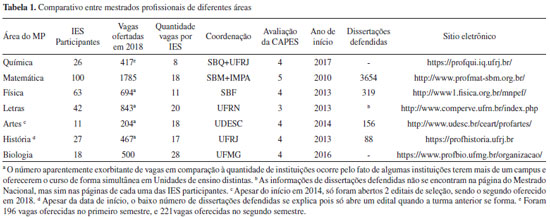 O PROFQUI FRENTE AOS OUTROS MPs DE FORMAÇÃO DOCENTE Todos os MPs voltados para a formação do docente, por sua natureza, têm características comuns: o foco para a pesquisa associada a atividade laboral relacionada à educação básica; a forma de ingresso se dá através de um exame nacional de acesso realizado anualmente; o desenvolvimento de um produto final obrigatório, aplicável à realidade profissional do participante. O que os diferencia um do outro são as inúmeras peculiaridades. Neste sentido, aqui se apresentam dados e levantamentos preliminares, mas que possibilitam identificar diferenças importantes (Tabela 1) e o potencial do presente trabalho por estar começando juntamente com o início do PROFQUI. Comparado com outros MPs de mesma finalidade, como pode ser visto na Tabela 1, o início do PROFQUI é concomitante com o início da pesquisa longitudinal na qual este artigo se insere, e é um dos mais recentemente implantados. A baixa quantidade de vagas indica uma alta possibilidade de crescimento e se explica por questões de divulgação (devido ao início recente), além da proposta de começar aos poucos, consolidar e atuar para crescimento permanente. A proposta central e inicial deste MP é que as pesquisas desenvolvidas promovam a reflexão do docente sobre algum problema educacional real dentro do ensino de Química, enquanto possibilita ao docente o acesso a novas propostas didático-metodológicas, utilizadas pelos professores das IES, que contribuam para a sua atuação profissional, e o amadurecimento e consolidação dos conhecimentos químicos, como ponto principal da proposta do Programa. Nesse sentido, uma pesquisa em andamento como esta, acompanhando o desenvolvimento do PROFQUI, tem muito a contribuir; ainda mais diante do papel fundamental da primeira turma e com o perfil dos pesquisadores aqui envolvidos, qual seja, do uso de tecnologias em prol da melhoria da educação.