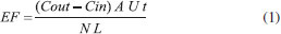 A escolha dos pontos de coleta é bastante crítica e apresenta grande variedade na bibliografia sobre o assunto. Alguns autores coletam a primeira amostra externamente ao túnel, perto da entrada, sendo a outra amostra coletada no interior do túnel.7-10 Em outros estudos, é escolhido um ponto de coleta no interior do túnel (entre 30 e 200 m da entrada) e outro ponto no interior, mais perto da saída.13-15 Como, por exemplo, no estudo realizado no túnel Shing Mun (Hong Kong), onde os autores coletaram a 686 m da entrada e a 350 m da saída.6 Neste trabalho optou-se pelas coletas nos pontos 1 e 2 (Figura 2), ambos localizados no interior do túnel. Esses pontos são locais utilizados como suporte pela administração do túnel e os únicos com a infraestrutura e segurança necessárias ao estudo. Foi decidido não realizar a coleta no exterior porque são locais localizados na encosta do maciço da Tijuca, em áreas pouco representativas, com grande ocorrência de emissões biogênicas e fortemente influenciadas por condições meteorológicas. Para a determinação da taxa de emissão de compostos carbonílicos foram realizadas amostragens simultâneas, de aproximadamente 120 minutos de duração, em cada um dos pontos indicados na Figura 2. As coletas de compostos carbonílicos foram realizadas em oito campanhas, onde foram coletadas duas amostras por ponto. Assim, foram coletadas 16 amostras no ponto 1, mais próximo da entrada, e 16 no ponto 2, mais afastado desta mesma entrada. As campanhas foram realizadas nos dias 07 de fevereiro, 01 e 13 de março, 06 e 14 de dezembro de 2018, 10 de janeiro, 07 de fevereiro e 27 de março de 2019, sendo todos dias úteis. Durante as campanhas, a primeira coleta do dia era realizada, aproximadamente, entre 9:00 e 11:00 horas e a segunda entre 11:00 e 13:00 horas. Na Tabela 1S (Material Suplementar) são apresentados os dias e horários das campanhas realizadas. Para as coletas foram utilizadas bombas de baixo volume modelo KNF NMP 850 operadas a bateria e calibradas com o calibrador DryCal, modelo DC-lite 717-04. Foram empregados cartuchos de 150 mg SiO2-C18 (Sigma LpDNPH S10) impregnados com solução ácida de 2,4-dinitrofenilhidrazina (DNPH), que reage seletivamente com as carbonilas formando os respectivos derivados carbonilados de hidrazona. Do total de oito campanhas realizadas, em cinco também foram monitorados CO, CO2 e a temperatura, todos de forma contínua e com a utilização do analisador marca Instrutemp, modelo ITMCO2 - 600. Operando com a tecnologia de infravermelho não dispersivo (Non-Dispersive Infrared - NDIR), o equipamento processa medidas a cada minuto e os valores foram integrados para o mesmo tempo de coleta dos compostos carbonílicos. Análises químicas A coleta e determinação dos compostos carbonílicos foram baseadas no método U.S. EPA TO-11A.16,17 Os compostos foram eluídos dos cartuchos com acetonitrila (Merck, grau HPLC, teor mínimo de 99,9%) e avolumados a 5 mL. Os compostos carbonílicos foram analisados por cromatografia líquida de alta eficiência com um equipamento modelo Agilent Technologies 1100 Series, composto de bomba binária (G1379A), de autoamostrador (G1313A), de degaseificador (G1379A) e de um detector de UV-DAD, código G1315B (λ=360 nm). O volume de injeção foi padronizado em 10 μL e o gradiente da fase móvel foi variável de 35% de água ultrapura e 65% de acetonitrila (até os 9 minutos de corrida), passando para 100% de acetonitrila após os 9 minutos. A coluna utilizada na separação dos compostos foi uma Zorbax Eclipse XDB (4,6 mm × 15 mm × 5 µm). O fluxo da bomba foi de 1,2 mL min-1 com 13 minutos de corrida e a temperatura do termostato foi ajustada em 30 °C. Os padrões utilizados na análise foram preparados através da diluição da mistura Supelco (CARB Carbonyl-DNPH Mix 1) em acetonitrila. Foram geradas curvas com cinco níveis de concentração para todos os 13 compostos carbonílicos presentes no padrão. A integração dos picos foi realizada com o software ChemStation, desenvolvido pela Agilent Technologies. Os compostos e seus respectivos coeficientes de determinação foram: formaldeído (0,9982), acetaldeído (0,9983), acroleína (0,9977), acetona (0,9983), propionaldeído (0,9999), crotonaldeído (0,9975), metacroleína (0,9975), butiraldeído (0,9977), 2-butanona (0,9969), benzaldeído (0,9942), valeraldeído (0,9986), ciclohexanona (0,9865) e p-tolualdeído (0,9975). O limite de quantificação (LQ) foi de 0,83 mg m-3 para formaldeído, 1,0 mg m-3 para ciclohexanona e 0,42 mg m-3 para os demais compostos. Fator de emissão veicular A metodologia para cálculo do fator de emissão utilizada neste estudo é baseada no cálculo da diferença de concentração dos compostos medidos em dois pontos localizados no interior de um túnel. Considera que não ocorrem reações químicas entre os compostos emitidos e que a turbulência relacionada ao movimento dos veículos torna a mistura dos compostos sempre homogênea, independente do ponto de coleta. Nesse estudo foram calculadas as taxas de emissão utilizando as metodologias de Pierson e a metodologia que leva em consideração o consumo de combustível.2,7,18-21 Na metodologia de Pierson, o cálculo do fator de emissão é realizado utilizando a equação (1).18,19 ![]() em que: EF = Fator emissão veicular; Cout e Cin = representam as concentrações em massa de poluentes específicos nos dois pontos monitorados, em mg m-3; A = área da secção transversal do túnel, em m2; U = velocidade do vento, em m s-1; t = tempo de amostragem, em s; N = número de veículos; L = a distância entre os dois pontos monitorados, em m. Depois de processado na equação, o valor do fator de emissão foi expresso em g km-1. O cálculo do fator de emissão veicular a partir do consumo de combustível, é fundamentado na quantidade de poluente emitido por massa de combustível queimado, ou seja, considera que a concentração de 