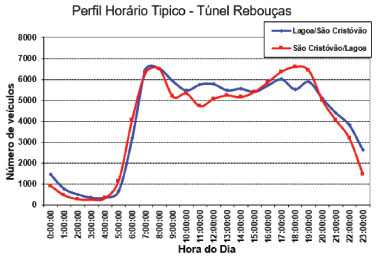 ![]() Figura 1. Valores típicos de fluxo veicular no túnel Rebouças para um dia útil. Fonte: Prefeitura da Cidade do Rio de Janeiro