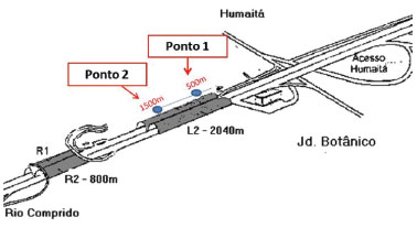 A composição da frota circulante também pode ser considerada característica. Conforme dados da administração do túnel Rebouças, os veículos leves representam 94% de toda a frota circulante, a fatia dos veículos pesados só alcança 1% do total, sendo restrita a ônibus e aos poucos caminhões autorizados, como, por exemplo, de limpeza urbana e bombeiros. As motos, com 4%, e os denominados veículos médios (1%), as vans, por exemplo, completam a estatística. Mesmo levando em consideração o valor máximo permitido e controlado por radar de 90 km h-1, a velocidade média dos veículos estimada dentro do túnel não ultrapassa os 70 km h-1. A grande quantidade de veículos, principalmente nas horas de pico, não permite o desenvolvimento de uma velocidade mais expressiva. Amostragem Foram escolhidos dois pontos de coleta dentro do túnel, o primeiro localizado a 500 metros da entrada pela zona sul (Humaitá) e o segundo distante 1500 metros dessa mesma entrada. Assim, a distância entre os dois pontos de monitoramento foi de 1000 metros. A Figura 2 apresenta a localização dos dois pontos de amostragem localizados dentro do túnel Rebouças.