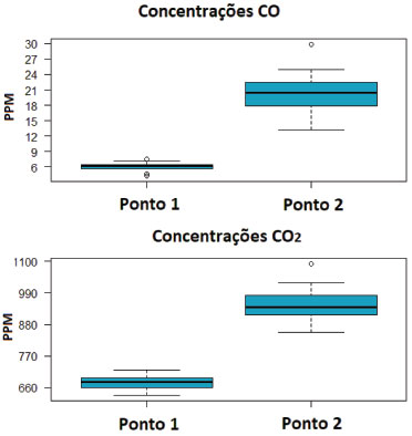 RESULTADOS E DISCUSSÃO Nos pontos 1 e 2 foram medidas temperaturas médias, para todos os dias de coleta, de 32,51 ± 0,96 °C e 33,88 ± 1,00 °C respectivamente. Esses valores são importantes na caracterização do túnel como um local relativamente blindado das alterações meteorológicas que ocorrem em ambientes abertos. A velocidade do vento, medida pelo anemômetro portátil modelo Thal-300, apresentou velocidade média de 20 km h-1 na direção do fluxo veicular. O CO e o CO2 foram medidos de forma direta e contínua com dois monitores portáteis, um instalado no primeiro ponto de amostragem e outro no segundo ponto. Os valores foram obtidos a cada minuto e foi calculado um valor médio para o período de cada coleta. As concentrações médias para CO no primeiro ponto de amostragem, a 500 m da entrada do túnel, apresentaram valores entre 4,3 ± 2,5 ppm e 7,6 ± 2,0 ppm e para o segundo ponto, o intervalo foi de 13,3 ± 4,6 até 29,9 ± 4,7 ppm. Em relação ao CO2 os valores das concentrações médias para o primeiro ponto se encontraram entre 632,9 ± 21,8 ppm e 721,2 ± 43,8 ppm e no intervalo de 880,9 ± 54,8 ppm a 1091,3 ± 92,7 ppm para o segundo ponto de amostragem. A Figura 3 apresenta o resumo em boxplot das concentrações medidas para CO e CO2 nos pontos 1 e 2.