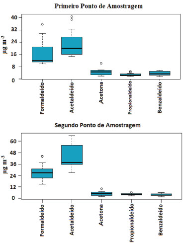 Em ambos pontos de coleta foram identificados os seguintes compostos carbonílicos: formaldeído, acetaldeído, acetona, propionaldeído e benzaldeído. Os outros compostos se encontraram com concentrações menores que o LQ. O formaldeído e acetaldeído foram os dois compostos mais abundantes. O formaldeído apresentou concentração média de 15,9 ± 7,9 µg m-3 no primeiro ponto de amostragem e 26,9 ± 8,5 µg m-3 no segundo ponto. Em relação ao acetaldeído, a média das concentrações foi de 22,0 ± 8,5 µg m-3 e 42,4 ± 13,1 µg m-3 para o primeiro ponto e para o segundo ponto de amostragem, respectivamente. Esses valores indicam que o formaldeído e o acetaldeído representam aproximadamente 73% de todos os compostos carbonílicos identificados para o primeiro ponto e 80% para o segundo ponto de amostragem. Na Figura 4 são apresentadas, na forma de boxplot, as concentrações dos cinco compostos carbonílicos identificados.