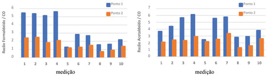 ![]() Figura 5. Razões entre as concentrações [formaldeído/[CO] e [acetaldeído]/[CO] calculadas para os dois pontos de coleta e os cinco dias em que foram determinados todos os compostos (duas determinações por dia)