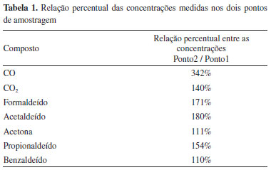 Da mesma forma que ocorreu com o CO e o CO2, para os compostos carbonílicos também foram observadas concentrações maiores no ponto 2, se comparadas com as do ponto 1. Esse é o perfil esperado também pelo princípio de acumulação, porque o ponto 2 de amostragem está mais distante da entrada do túnel que o ponto 1. Na Tabela 1 são apresentadas as relações percentuais de concentrações entre os dois pontos estudados.