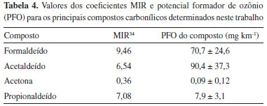 Nas amostras analisadas e levando em consideração as taxas de emissão calculadas pela metodologia de Pierson, o acetaldeído (PFO de 90,4 ± 37,3 mg km-1) e o formaldeído (PFO de 70,7 ± 24,6 mg km-1) foram os compostos que mais contribuem para a formação de ozônio.