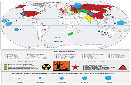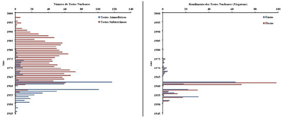 ![]() Figura 4. Distribuição dos testes nucleares atmosféricos e subterrâneos e rendimentos dos testes nucleares de fusão e fissão