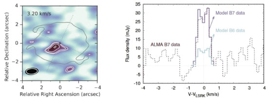 ![]() Figure 1. The first detection of methanol in circumstellar gas of a protostar (TW Hya) measured with the ALMA radio telescope in the extension of 317 GHz14