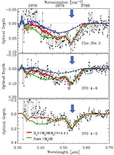 ![]() Figure 2. Infrared spectra with features indicating the presence of methanol in the solid phase (band at 3.53 micrometers) in the vicinity of young objects embedded in Serpent and Chameleon molecular clouds complexes (black dots). Lines indicate Laboratory spectra of ices containing methanol for comparisons purpose16