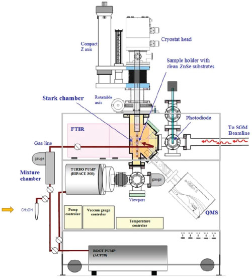 METHODOLOGY In an attempt to simulate space environments (high vacuum, low temperature, and radiation field), we employed the chamber coupled to the SGM beamline of the Brazilian Synchrotron Light Source (LNLS/CNPEM). We operate the beamline in off-focus and broadband mode to simulate the effects caused by broadband soft X-rays (6 to 2000 eV) in an icy sample. The broadband photon energy distribution (white beam mode) was obtained by placing the monochromator at the zero the order of reflection (the grating acts like an ordinary mirror and the white light exits from the monochromator). The average flux was 1 × 1014 photons cm-2 s-1. More details were given by Pilling and Bergantini.20 Briefly, gaseous CH3OH was slowly deposited into a clean ZnSe substrate crystal couple to helium closed-cycle cryostat at the vacuum chamber, through a capillary tube kept about 0.5 cm from the crystal during about 5 minutes forming ice with 1.1 mm of initial thickness. To determine the sample thickness, we employed the equation: ![]() where N, M, and ρ are the initial column density in units of molecule cm-2, the molar mass in units of g mol-1, and density in units of g cm-3 for the considered species, respectively.21 The pressure in the chamber before the deposition phase starts and during methanol deposition was between 10-8 and 10-7 mbar. The ice was irradiated with broadband soft X-rays during 250 minutes at a constant temperature of 12 K. The chemical changes in the icy sample were monitored by the transmittance FTIR spectroscopy (Agilent Cary - 630 Portable FTIR). The infrared spectra obtained has a resolution of 1 cm-1 and a spectral range of 4000 cm-1 to 900 cm-1. The spectral analysis performed in this paper employ OMNIC and ORIGIN software. Figure 3 shows a diagram with the experimental chamber employed in this work. In it, we can observe the CH3OH ampoule added before the mixture chamber (left side, indicated with the arrow) and the input from the SGM beamline (Synchrotron Radiation) on the right side.