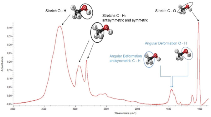 The formation of interstellar methanol can occur both in the gas phase and on the surface of astrophysical ices. However, the reactions in the gas phase are insufficient to justify the relative abundances of methanol detected and, therefore, reactions involving grains become necessary.15 As an example of the detection of methanol in the solid phase, graphs related to the detection of the molecule in young stellar objects with intermediate-mass such as Reipurth 50 (Figure 2) located in the Serpent and Chameleon molecular clouds complexes.16