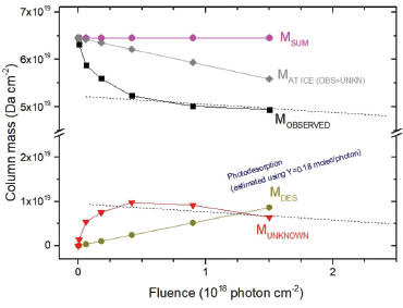 ![]() Figure 7. Evolution of column mass of material (observed and not observed) during methanol irradiation with broadband soft X-rays as a function of fluence