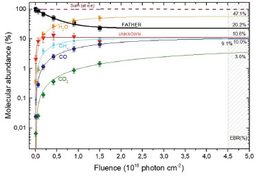 ![]() Figure 8. Percentage evolution and percentage destruction of the abundance of species of methanol irradiated with photons indicated as a function of photon fluence. The gray rectangle indicates the estimated region of the chemical equilibrium fluence (FE). From this fluence onwards the chemical composition of the sample practically does not change during the processing by the ionizing radiation