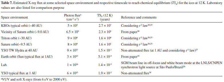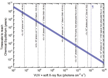 The plot, indicated in Figure 9, identify the timescale to reach chemical equilibrium (TSE) as a function of photon flux (mainly soft X-rays). Vertical lines show the flux of selected space environments illuminated by in VUV and soft X-rays, as well as the laboratory photon flux employed in this work for comparison. In the case of the vicinity of Saturn (at 9 AU), we observe that considering only the incoming solar VUV and soft X-rays, the estimated timescale to reach chemical equilibrium is around 105 years.