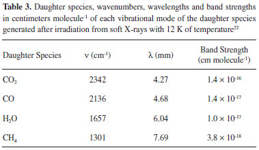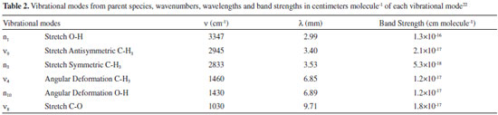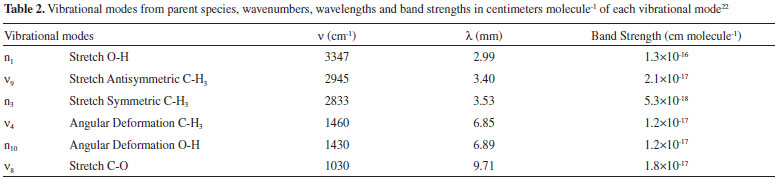 The band strength of each vibrational mode, from parent and daughter species, were properly listed from literature and present in Tables 2 and 3.