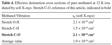 The numerical evolution equations of the abundance of methanol adjusted the curves of presented graphs and gave origin to the table (Table 4) with an indication of the effective destruction cross sections of each band. The C-O stretch ("backbone" of this molecule)23 is the chosen representant of effective destruction of methanol ice because this value is close to the average value (last line of Table 4) of the evaluated bands of methanol molecule.