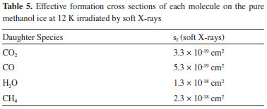 On the formation of daughter species in the soft X-rays irradiation, the data obtained experimentally were used to determine the numerical evolution of the abundance of each species indicated (CO2, CO, H2O and CH4). Table 5 shows the effective formation cross sections of each molecule.
