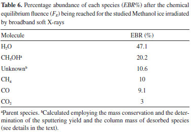 CONCLUSIONS In this work, we present experimental results on the irradiation of methanol ice (12K) employing broadband soft X-rays in an attempt to simulate the methanol rich ices processing by ionizing radiation in space environments. The experiments occurred at the Brazilian Synchrotron facility LNLS/CNPEM, employing a high vacuum chamber and infrared spectrometer (FTIR) coupled to the SGM beamline up to photon fluences of 1.5 × 1018 photons cm-2. The frozen sample was monitored and analyzed by infrared spectroscopy. The main conclusions were: i) New molecules produced during photolysis were identified, such as CO, CO2, H2O, and CH4, based on their characteristics of infrared absorption bands. The mass of unknown species was estimated by considering mass conservation in the system and molecular desorption. The desorption yield was estimated to be around 0.18 molecules per photon. ii) The effective destruction cross section for methanol due to the employed broadband X-rays was around 2.1 × 10-18 cm2. The determined effective formation cross section for daughter species with bands visible on infrared spectra were: 3.3 × 10-19 cm2 (CO2), 5.3 × 10-19 cm2 (CO), 1.3 × 10-18 cm2 (H2O), 2.3 × 10-18 cm2 (CH4). iii) Molecular abundance percentages at equilibrium chemistry (or Equilibrium Branching Ratio - EBR%) were determined considering parent species, daughter species, and unknown material. The main photolysis product at chemical equilibrium (at large fluence) was H2O (47.1% of the assigned species) followed by the CO and CH4 (10% and 9.1%, respectively) The abundances of unknown species at equilibrium was 10.6%. iv) The timescale to reach chemical equilibrium (TSE) of pure methanol ice irradiated by broadband soft X-rays was estimated for some astrophysical environments. For example, for the interplanetary medium in the vicinity of Saturn (with photon flux of 6.5 × 105 cm-2 s-1) was roughly 2.3 × 105 years, while in orbit of Earth (with photon flux of 3 × 1013 cm-2 s-1) was roughly 5.1 × 10-3 years. This study helps to clarify better the effects of ionizing radiation on methanol abundant ices as well as the equilibrium chemistry phase that happens in icy surfaces in the interplanetary and interstellar medium and also corroborates that radiation induced chemistry by X-rays plays an essential collaboration in astrophysical environments.