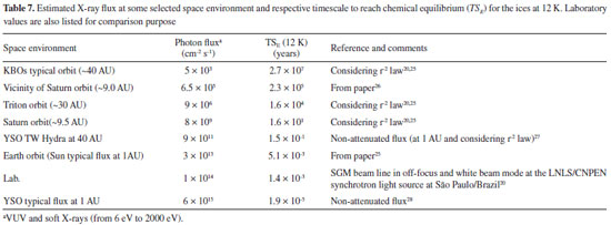 ![]() Figure 9. Timescale required for the icy system reaches chemical equilibrium as a function of photon flux (6-2000 eV). Vertical lines indicate fluxes in selected space environments