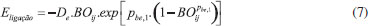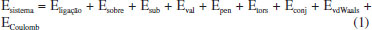 METODOLOGIA As simulações de dinâmica molecular reativa foram realizadas empregando o software LAMMPS (Large-scale Atomic/Molecular Massively Parallel Simulator) e o campo de forças ReaxFF. Esse campo de força reativa divide a energia do sistema em várias contribuições parciais de energia, como demonstrado pela Eq. (1):14,15 ![]() Em que: Eligação representa a energia de ligação; Esobre e Esub representa o átomo sob-coordenado com excesso e falta na contribuição de energia, respectivamente; Eval, Epen e Etors são os termos da energia do ângulo de valência, penalidade de energia (estabilidade do sistema) e energia do ângulo de torsão, respectivamente; Econj, EvdWaals e ECoulumb representam os efeitos de conjugação à energia molecular, interação de van der Waals e interação Coulômbica, respectivamente. A distância interatômica do ReaxFF é obtida a partir da ordem de ligação e a energia de ligação entre o par de átomos, de acordo com a Eq. (6). Nessa equação é possível observar a contribuição da ligação sigma (pbo,1 e pbo,2), da primeira e segunda ligação pi (pbo,3 e pbo,4) e (pbo,5 e pbo,6), respectivamente.1 ![]() As ordens de ligação BO'ij são, então, corrigidas por excesso de coordenação e por ordens de ligação residuais de 1-3 em ângulos de valência. Uma ordem de ligação corrigida (BOij) é usada para calcular as energias de ligação:14 ![]() O ReaxFF também considera o excesso e a falta de coordenação, os termos do ângulo de valência (contribuição de energia dos termos do ângulo de valência tende a zero quando BO é zero), os ângulos de torção (para BO → 0 e BO > 1), a energia molecular, as interações não ligadas de Van der Waals (interações repulsivas a curtas distâncias interatômicas devido às principais energias de ortogonalização e a atração de Pauli a longas distâncias devido à dispersão, para todos os átomos) e as interações de Coulomb (ajustadas para sobreposição orbital entre os átomos a distâncias próximas com um potencial Coulomb blindado).14 A simulação de modelagem molecular corresponde às seguintes etapas: (1) geração de modelo desvinculado; (2) inicialização; (3) reticulação e (4) equilíbrio final do sistema. A primeira etapa envolve a geração inicial de um modelo desvinculado aleatório a partir de monômeros separados e moléculas de extensor de cadeia. Aplica-se uma otimização de energia ao modelo inicial para minimizar a energia interna. A reticulação é iniciada aquecendo a caixa de simulação até a temperatura de cura desejada e o equilíbrio ocorre antes de iniciar a reticulação. No procedimento real, o número de ligações é formado em cada etapa de reticulação, seguido por um tempo de flexibilização para permitir que o sistema reaja às alterações da estrutura em rede. Dependendo do método específico, é formada somente a ligação com a menor distância reativa ou todas as ligações dentro de um determinado limite de reação.5 Os campos de força usados no ReaxFF foram otimizados usando uma técnica de busca sucessiva de um parâmetro, no qual dados obtidos de cálculos com a Teoria do Funcional de Densidade (DFT) foram utilizados. Calores de formação com erro absoluto de até 4,0 kcal mol-1 foram reproduzidas com emprego desta técnica. Em cada etapa da MD, esse campo de força atualiza as ordens de títulos e fornece o caminho para as ligações se formarem e quebrarem durante o curso da simulação. O ReaxFF pode reproduzir com precisão todos os dados relevantes de mecânica quântica, bem como fornecer descrições atomísticas de várias reações químicas complexas.14 A simulação da reação entre a resina epoxídica e a diamina foi realizada em uma célula unitária de dimensões 20 x 20 x 20 Å, contendo 15 moléculas de C2H4O (óxido de etileno ou epóxi-etano) e 35 moléculas de CH6N2 (metanodiamina). O sistema foi minimizado utilizando dinâmica molecular de baixa temperatura (5 K). Após a minimização, para a fase de produção foi usado o ensemble do tipo canônico (NVT), no qual o número de moléculas (N), volume da caixa (V) e temperatura (T) são mantidos constantes. A dinâmica molecular reativa envolve, geralmente, reações rápidas. O intervalo de tempo de 0,1 femtosegundos (fs) foi usado, enquanto o tempo total de simulação foi de 255 ps para a temperatura selecionada de 1500 K (temperatura elevada para acelerar as interações intermoleculares e reações químicas). As temperaturas foram controladas pelo termostato Berendsen, com temperatura de amortecimento constante de 100 fs. O sistema molecular é apresentado na Figura 3.