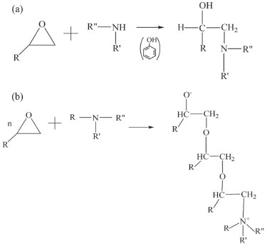 Os compostos de amina estão entre os agentes de cura epoxídicos mais antigos e usados. As aminas primárias (R-NH2) e secundárias (R-NH-R') sofrem as reações SN2 (Figura 2a) e são altamente reativas com epóxis. Dependendo dos substituintes, estas aminas podem ser divididas em três grupos principais: aminas alifáticas, cicloalifáticas e aromáticas. Entre estes grupos, as aminas aromáticas produzem resinas curadas com altas propriedades de resistência química e térmica. Entretanto, exigem longos ciclos de cura em alta temperatura (~ 150 ºC).8,9 Dessa forma, aplicações práticas demandam mais tempo e, consequentemente, são mais custosas.