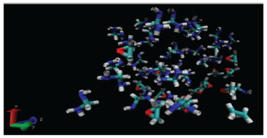 ![]() Figura 3. Célula unitária contendo 15 moléculas de óxido de etileno e 35 moléculas de metanodiamina. As terminações com cores azul claro, vermelhas, brancas e azul escuro representam respectivamente os átomos de carbono, oxigênio, hidrogênio e nitrogênio