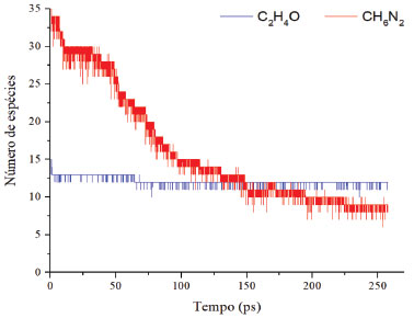 ![]() Figura 6. Variação do número de espécies dos produtos em função do tempo