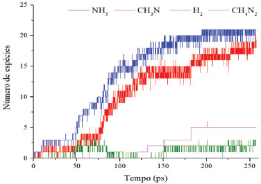 A reação apresentada acima foi construída com base na observação conforme a variação do sistema. Obviamente, um processo como esse não ocorre em uma única etapa, mas no sistema foi observada a formação e consumo de hidrogênio gasoso e molecular, o que subsidia a hipótese. A polimerização ocorre segundo um mecanismo reacional lento, o que acarreta a um tempo maior de simulação e, consequentemente, a modelagem completa do processo geraria um alto custo computacional. O tempo total das simulações apresentadas foi de, aproximadamente, 80 horas cada (2,5 milhões de iterações por simulação). A simulação da polimerização total do sistema levaria cerca de 50 vezes mais tempo, tendo em vista o estado do sistema após 80 horas de cálculo, mesmo com a temperatura elevada aplicada. A simulação à temperatura ambiente aumentaria o custo de simulação exponencialmente. Nas Figuras 5 e 6 estão representadas as variações dos reagentes e principais produtos (no caso, intermediários) durante a simulação, respectivamente.