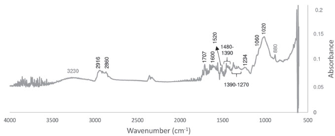 The part of the fruit, ripening stage,16 pretreatment application prior to drying, and drying conditions and methods25 can influence the physicochemical properties of flour. The banana pulp flour is generally lighter than that obtained from the peel, as demonstrated by Alkarkhi et al.,16 which may be due to phenols oxidation, degradation of pigments, caramelization and Maillard reaction during the drying process of the peels.25 The ripe "Prata" banana peel flour is acidic. Its pH and TSS content were lower than those of the ripe Cavendish banana peel flour (pH 5.47 and 3.46 °Brix).16 The TSS in banana peels corresponds to the presence of glucose, fructose, and sucrose, and the higher the stage of ripening, the higher this value.26 The WHC is the capacity of a material to retain water in its matrix and is related to the amount of protein and dietary fiber, mainly hemicellulose and pectin, and the physical condition of starch in the flour.16,27,28 In this study, the WHC was similar to the values found by Alkarkhi et al.16 and Torres-Oblitas et al.27 in ripe banana peel flours (6.1-8.2 g g-1 and 5.4 g g-1, respectively), but was greater than those found in unripe plantain peel flour (3.5 g g-1),29 pequi peel flour (3.7-4.0 g g-1),15 buriti peel flour (1.1 g g-1),30 and wheat flour (1.9 g g-1).31 Porosity, different particle size, preparation process, and various fiber structures can cause these variations.28 The OHC refers to the ability of a food to retain fat during its processing, preserving the flavor and improving texture.27,30 The OHC value of ripe "Prata" banana peel flour was comparable with that of unripe plantain peel flour (2.2-4.1 g g-1)29 and higher than those reported in ripe Cavendish banana peel flour by Alkarkhi et al.16 (0.93-1.28 g g-1) and by Torres-Oblitas et al.27 (0.9 g g-1), and in wheat flour (1.1 g g-1).31 Size and hydrophobic nature of the fiber particles, fiber composition, several surface properties, and total charge density can cause these differences in this property.28 The SC is related to porosity, crystallinity, and characteristics of the fibrous matrix components.17 The ripe banana peel flour had a SC value similar to those of the soluble dietary fiber of orange peel (4.8 and 6.3 mL g-1)17 and of papaya peel (4.1 and 4.5 mL g-1),32 indicating that it can be used as an ingredient in products for weight control, because it can increase the sensation of fullness.32 Therefore, the ripe banana peel flour had better technological properties than other types of flour and can be used in the preparation of bakery products to improve the texture, with claim of functional food.27 Regarding the chemical composition, it is observed in Table 1 that the banana peel flour is rich in insoluble dietary fiber, representing over 93% of total dietary fiber, containing high content of carbohydrates and significant amounts of proteins and lipids. Starch content is very low, due to the high stage of ripening. The moisture content is within the values recommended for flour by the Brazilian legislation, which must be less than 15%.33 Emaga et al.6 observed that, in general, the variety does not affect the centesimal composition of peels, unlike the ripening stage. These authors analyzed six varieties of banana peels in three stages of ripening, dehydrated at 60 °C for 24 h, and found that the more mature peels, i.e., in more advanced stages of ripening, showed higher levels of the constituents. Angelis-Pereira et al.34 analyzed unripe banana peels (ripening stage 3), variety "Prata", dehydrated at 60 °C for 36 h, and obtained similar results of protein (8.12%) and soluble dietary fiber (3.53%), while the contents of moisture, lipids and insoluble dietary fiber were lower, and those of ashes and carbohydrates were higher than the levels found in this study. In unripe bananas, starch is one of the main digestible carbohydrates but, during ripening, the starch content decreases while the soluble sugar increases, which occurs due to the action of enzymes that degrade starch and participate in the formation of sugars.26 According to these results, it was verified that the ripening stage of the fruit influenced the composition of the flour, due to the variations found in this study and those obtained by Angelis-Pereira et al.,34 corroborating with the observation made by Emaga et al.6 Fruit peels have a higher fiber content than the pulp, which is due to their protective function against external threats.30 The highlight of the ripe banana peel flour obtained was its high content of dietary fiber, with the insoluble portion at highest concentration. Health organizations recommend an intake of 25 to 38 g day-1 of dietary fiber for body functionality in adults,35 so the use of this flour is a good alternative as an ingredient in many products. The FTIR spectrum was obtained to verify the functional groups present in the ripe banana peel flour (Figure 1) and was similar to the spectrum reported by Pelissari et al.36 and Oliveira et al.37