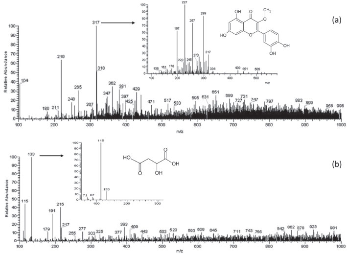 ![]() Figure 2. Representation of (a) PS(+)-MS and MS/MS spectra of the 3-O-methylquercetin (m/z 317); (b) PS(-)-MS and MS/MS spectra of the malic acid (m/z 133) of ripe banana peel flour