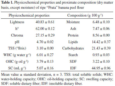 RESULTS AND DISCUSSION Characterization of ripe banana peel flour The physicochemical properties and the proximate composition results are shown in Table 1. The ripe banana peel flour exhibited brown color. Similar color was found in peel flours from bananas of different stages of ripeness and variety in the studies of Alkarkhi et al.16 and Castelo-Branco et al.24