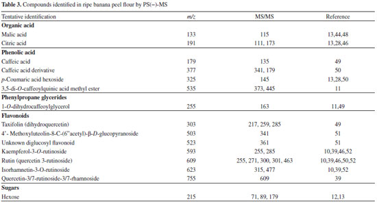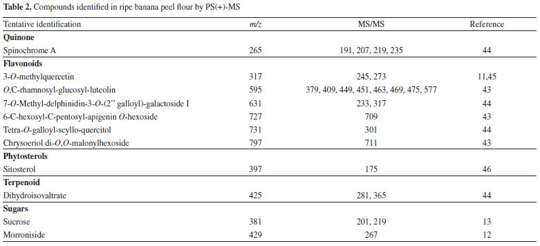 SUPPLEMENTARY MATERIAL A table containing the compounds identified in ripe banana peel flour by PS-MS, with their CAS numbers and chemical structures, can be freely accessed at http://quimicanova.sbq.org.br in PDF format.