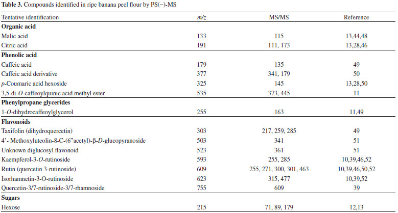 CONCLUSIONS Banana peel is a waste of easy availability and low cost from which one can obtain a flour that contains bioactive compounds, antioxidant property, high levels of carbohydrates and dietary fiber, and may be an alternative source for the development of new products. The antioxidant activity had strong positive correlation with the content of total phenolic compounds. By the PS-MS technique, in a quick and simple way, eleven compounds were tentatively identified by the positive mode and fifteen by the negative mode, such as organic acids, phenolics acids, flavonoids, sugars, quinone, and terpenoids in the ripe banana peel flour. It is noted that this study was the first to employ the ionization technique by paper spray to evaluate the chemical profile of ripe banana peel flour.